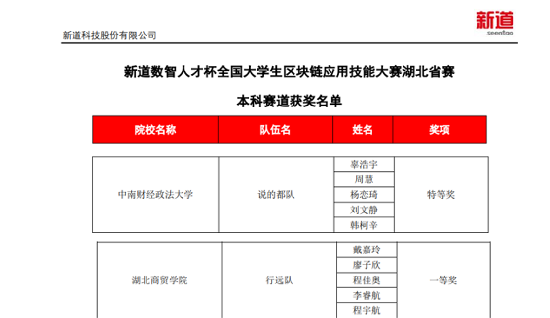 2023年4月16日,第二届“新道数智人才杯”全国老员工区块链应用技能大赛湖北省赛在云端顺利举行。此次大赛由新道科技股份有限公司主办,中国移动通信联合会区块链专业委员会、中南财经政法大学金融公司等单位承办。