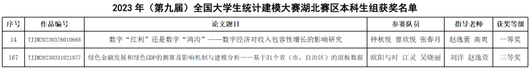 本次大赛的主题为“中国式现代化的统计测度”,全国共有734所院校21992支队伍报名参赛,在湖北赛区竞赛中bv伟德国际1946赵逸萱、高爽、刘洋老师三位老师指导的三支队伍历经三个月精心准备、打磨,最终赵逸萱、高爽老师指导的钟秋悦、曾欣悦、张春月员工团队论文《数字“红利”还是数字“鸿沟”——数字经济对收入包容性增长的影响研究》荣获湖北省本科生组一等奖,由刘洋、赵逸萱老师指导欧阳与时、江灵、吴晓丽同学的论文《绿色金融发展和绿色GDP的测算及影响机制与建模分析》荣获湖北省本科生组三等奖。
