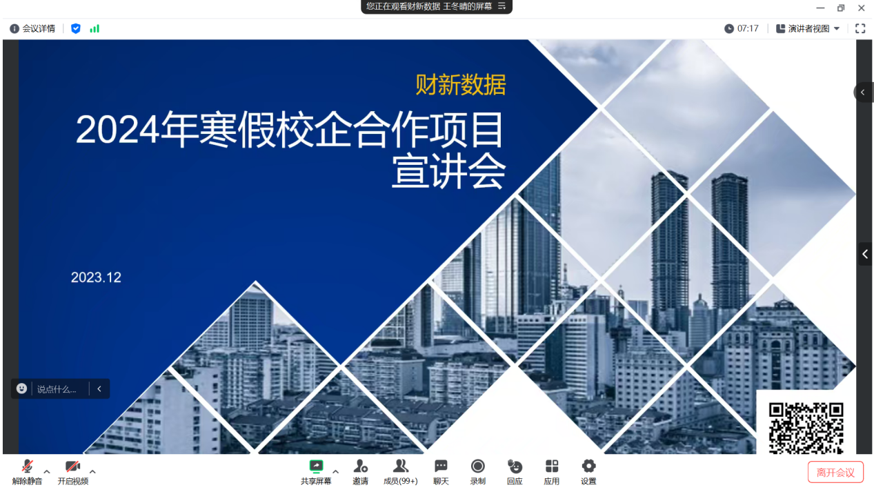 在成功举办暑期实践项目的基础上,bv伟德国际1946与财新数据公司再度携手,于2023年12月28日,通过腾讯会议平台,成功启动了寒假校企合作实践项目——“ESG专题”宣讲会。本次宣讲会由财新数据公司数据分析部的王冬晴老师担任主讲人,吸引了bv伟德国际19462022级和2021级共计150余名员工踊跃报名参加。此次实践项目旨在深化员工对ESG领域的理解与实践能力,为未来的职业发展奠定坚实基础。