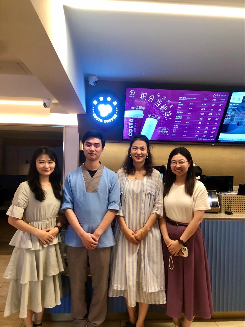 接着三位老师走访上海义隆酒店有限公司(汉庭酒店上海徐家汇交大宜山路店),看望在该酒店就业的朱瑞鹏同学。同样作为华住领航计划的优秀学员,朱瑞鹏目前的岗位是高级前台接待,独立负责前台综合事务,他从基本业务、处理客诉、销售技巧等方面进行了分享。苏晓梦老师表示从员工的成长中可以看出,华住集团和毕业生实现了“双向奔赴”。