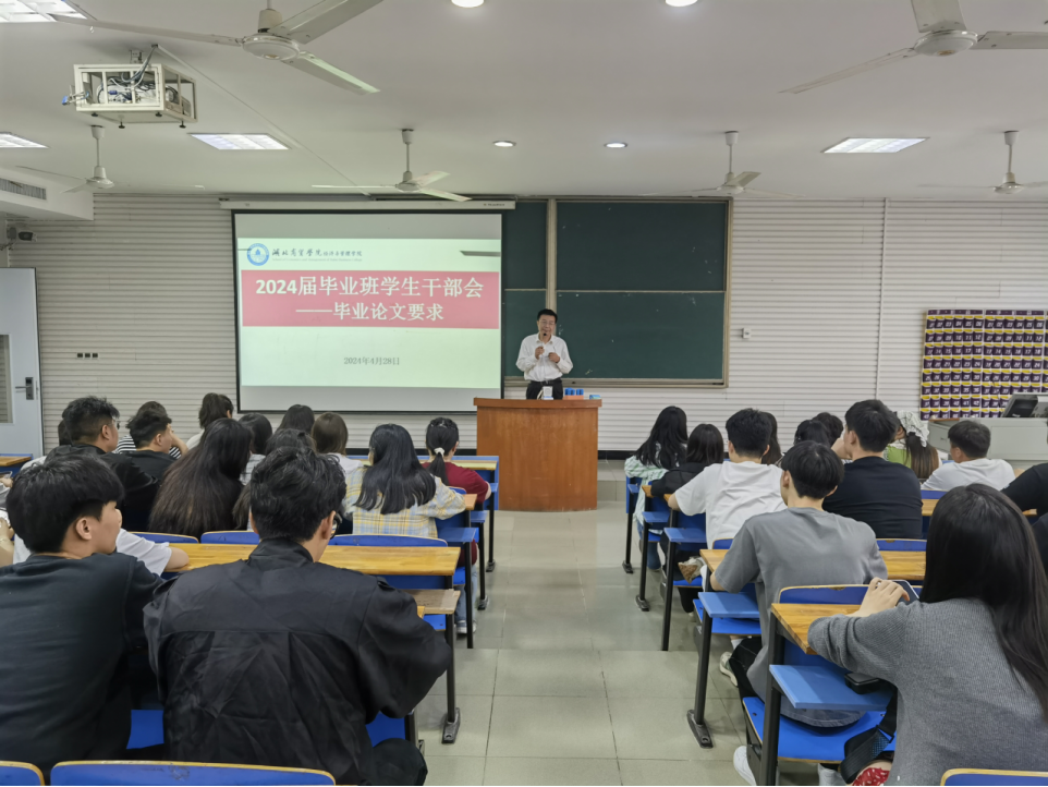 下午五点,严良在C201教室继续召集全体毕业班员工干部,就毕业论文要求进行再次集中强调。他首先代表公司全体教师对2024届本科毕业生表达美好祝愿,希望722位同学能顺利完成毕业论文答辩。同时就同学们毕业论文第一次答辩反映出的普遍性、突出性问题逐一进行讲解,要求员工干部会后召开班会集中传达会议精神,全体毕业生不断提高自我要求,以严谨、积极、认真的态度对照论文格式规范和答辩评委意见落实毕业论文的修改完善工作。