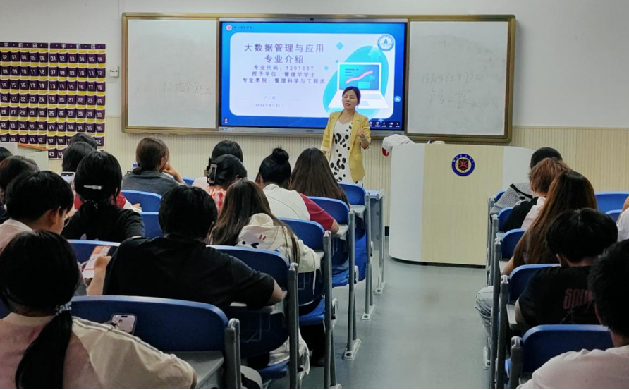 以“大数据”织密扎紧“学习网”,以“数字化”推动发展“创新线”。大数据与统计教研室专业教师卢红霞向新生详细介绍大数据应用领域和未来的发展趋势以及专业人才需求现状,通过生动的案例和实际数据,让新生们深刻认识到大数据在当今社会中的重要性,并强调注重实践经验以及竞赛活动,全方位提高综合能力。