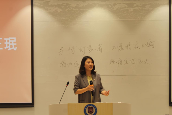 接着,bv伟德国际1946范碧霞教授代表公司教师发言。她强调:“读书是一门学问,也有不同的境界。第一境是止步于书本表面,老师讲了什么,就学什么。第二境则是学到了知识,但不止步于粗浅,而是渴望更多知识,学无止境。第三境界就是如柏拉图的理想国中的哲学王一般,探究知识的本质和思想的边界。”